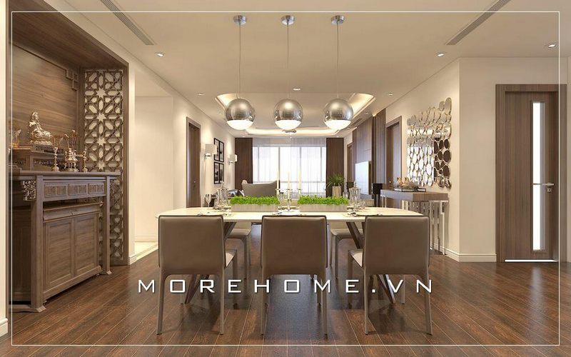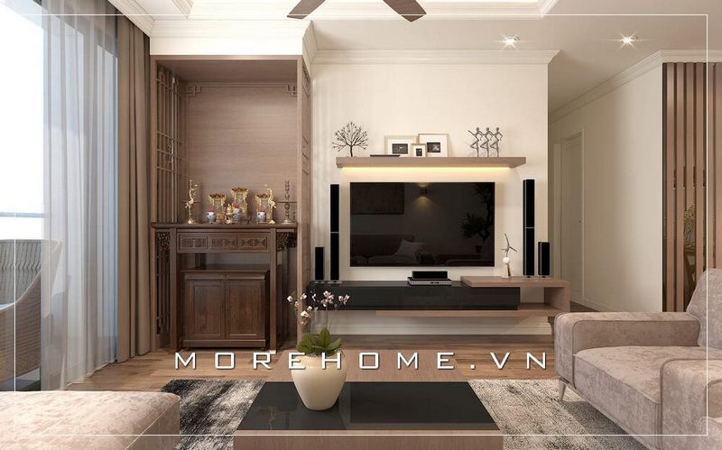 Ấn tượng với mẫu bàn thờ gỗ tự nhiên hiện đại được đặt trong phòng khách, biến căn phòng khách chung cư trở nên tâm linh vừa có tính trang trí thẩm mỹ cao.