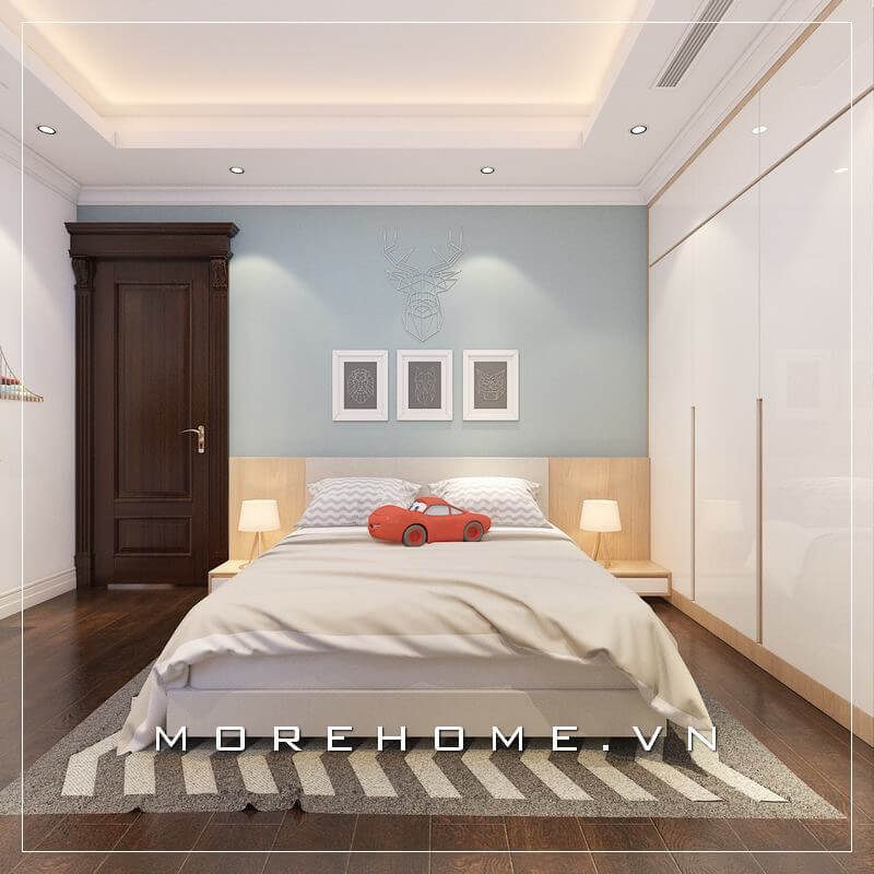 Giường ngủ bé trai hiện đại, gia chủ lựa chọn gam màu xám nhạt tạo điểm nhấn nhẹ nhàng cho cả căn phòng