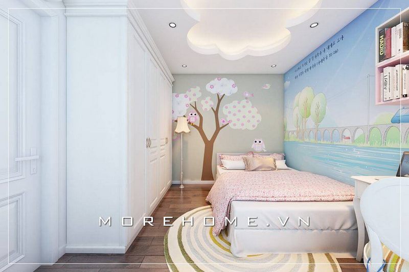 Giường ngủ bé gái hiện đại được bố trí liền kề với kệ tủ quần áo mang đến sự tiện nghi cho con trong quá trình sinh hoạt và nghỉ ngơi
