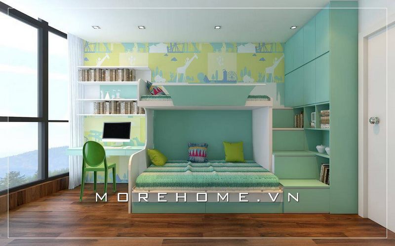 Thiết kế giường ngủ trẻ em hiện đại đầy ấn tượng, KTS khéo léo lồng ghép kết hợp với tủ kệ, bàn học, tab đầu giường cùng chất liệu tạo cho không gian thêm rộng thoáng và tiện nghi