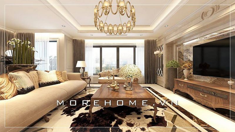 Mẫu thiết kế phòng khách chung cư cao cấp kết hợp nội thất tân cổ điển với đường nét tinh tế mang đến vẻ đẹp sang trọng đẳng cấp
