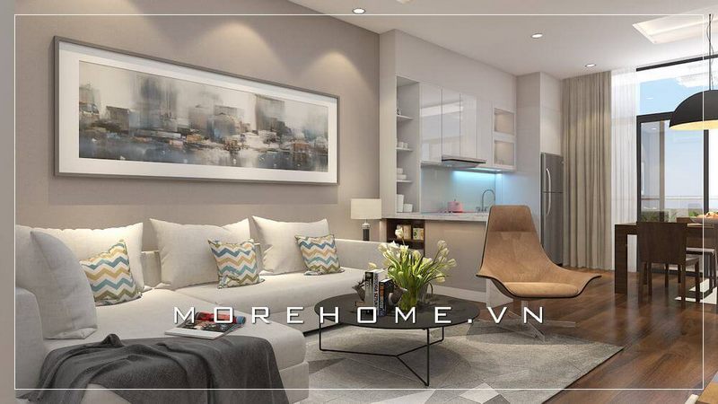 Tại căn chung cư nhỏ, việc thiết kế khu vực ăn uống liết kết trực tiếp phòng khách vừa tiết kiệm diện tích vừa tăng độ thông thoáng cho nhà ở