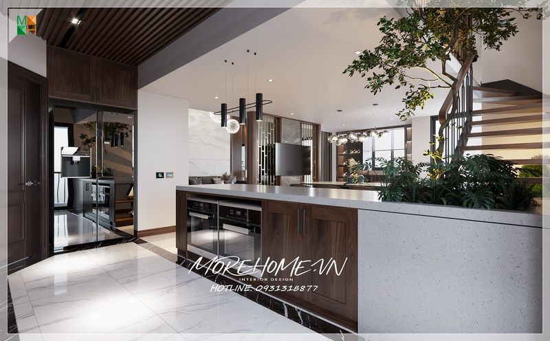Hệ thống bàn đảo bếp bằng gỗ tự nhiên kết hợp mặt đá nhân tạo giúp tăng thêm không gian để đồ bếp