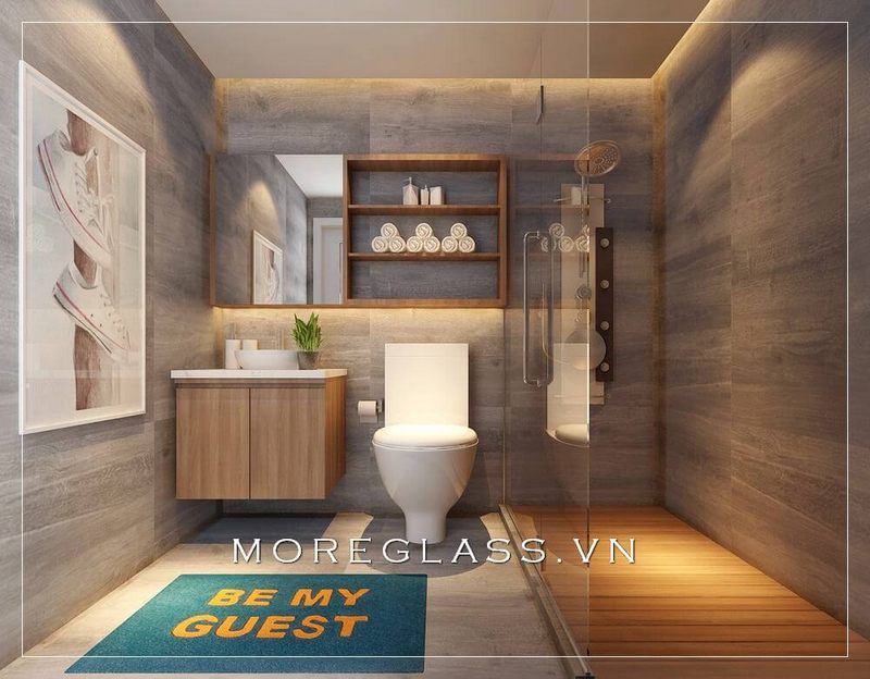 Một trong những vật liệu được sử dụng phổ biến trong thiết kế căn phòng tắm nhỏ là kính. Kính giúp gia tăng ánh sáng tự nhiên trong không gian, mang lại cảm giác rộng rãi và thoải mái. Bạn có thể sử dụng các vật liệu kính trong việc xây dựng hoặc che bụi ngăn nhiều công trình tiện ích từ khoang chứa đồ tới đến hàng shower mini hoặc shower cabintiền hàng của bạn.