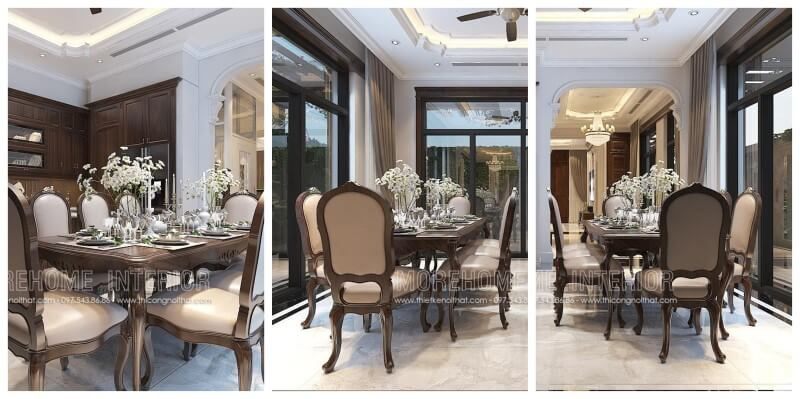 Bộ bàn ghế ăn tân cổ điển đẹp, mang lại sự sang trọng cho phòng ăn biệt thự của tôi.
